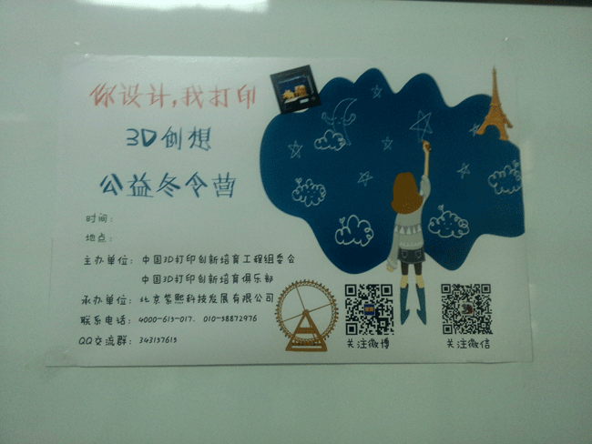 1月30日下午,由中国3D打印创新培育工程组委会主办,北京紫熙科技有限公司承办,“3D创想”中小学公益冬令营昌平区培训班在北京市昌平区第一中学开班。此次活动时长为3天半,至2月2日结束。本次活动主要向中小学生普及3D打印知识、3D设计软件的基本操作方法,其目的是为贯彻“3D打印技术要从娃娃抓起”的公益项目。该项目由原航空航天部部长林宗棠提议、被国务院及相关部委批准立项。