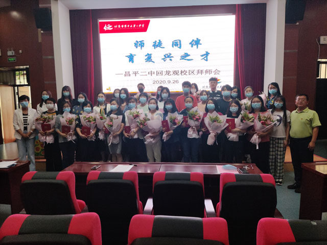 2020年9月26日,昌平二中教育集团回龙观校区举行2020-2021学年“师徒同伴,育复兴之才”青年教师拜师仪式。14名老教师与20名三年以下年轻教师在全体一线教师的见证下,结成师徒,开启为期一年的新教师培养任务。