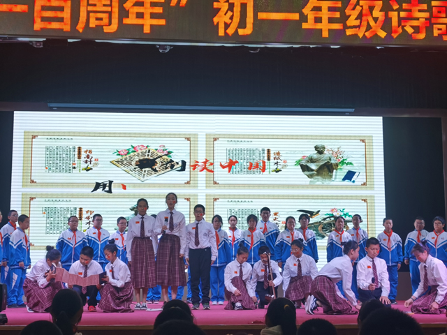 从立地暗沙到黑龙江,从帕米尔高原到乌苏里江。几度阴晴,几度离合,几度舒缓,几度壮阔。我们为你骄傲,更为你自豪。初一(1)班的同学们带来了组诗朗诵《我爱你,中国》。充满民族特色的服装及乐器演奏展示出了同学们的创意及才艺,更为精彩的朗诵增色不少。