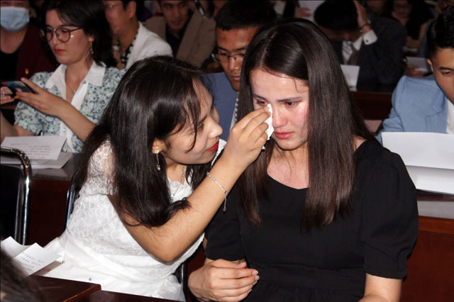 远在新疆学生家长发来视频,祝贺学生们的顺利毕业、感谢学校领导和老师们四年来像父母一样关心、引导学生的健康成长;学生阅读家长手书信件,不禁为之动容、潸然泪下,3对父母和孩子相继登台的亲情告白,感动在场每一名学生和家长,学生用语言和拥抱向父母表达感恩,家长也对学生提出殷切希望和步入社会应负的责任担当;学生更是用一副《沁园春雪》书法作品赠送母校,祝愿母校厚德载物,名震京师!