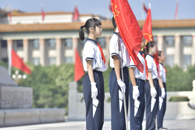 上午9点,少年先锋岗活动正式开始。在执行小队长的“一,二,一”口号声中,第一队站岗的6名队员身着整洁的校服,手带白色手套,佩戴着鲜艳的红领巾,高举少先队旗帜,步伐一致地走向人民英雄纪念碑。同学各个身姿挺拔、精神饱满,标准的动作和自信的风范,成为广场上一道特殊的风景。游客行人纷纷驻足,为队员们竖起了大拇指,队员们脸上扬起自豪的笑容。