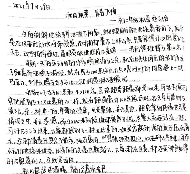 一根小小的接力棒不仅连接着我们班的团结精神,还传递着我们奋勇向前的拼搏精神。4x100接力赛凝聚着辛苦训练的汗水和追求卓越的体育精神。当我看到四位女孩利用中午饭后活动时间在操场一遍一遍训练时,我从内心佩服她们。那一刻,我被同学们的团队精神深深地打动了,如果每位运动员都有这样的信念,还有什么困难不能克服呢?