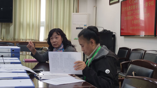 2021年10月14日下午,昌平区督导室第一责任区第一督导组组长王淑霞、挂牌督学虎素菊到昌平二中教育集团政府街校区进行学校“双减”工作专项督导。此次督导检查是根据市区相关文要求、统一部署和工作统筹,采取挂牌督学经常性督导与责任督学专项督导相结合的方式,对学校开展义务教育学段 “双减”工作落实情况进行专项督导检查。