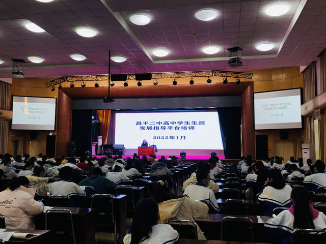 2022年1月18日下午,昌平二中邀请区教委《高中学生生涯发展指导平台》的开发专家之一曾老师到校做了高中学生生涯发展指导平台的使用培训,高一年级全体学生及班主任参加了培训。