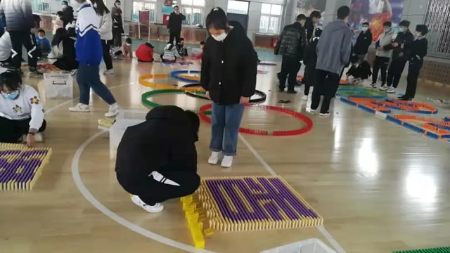 2022年1月26日,昌平二中携手昌平区多米诺运动协会开展了“激情迎冬奥,一起向未来”多米诺骨牌展示活动。昌平二中内高班学生和来自昌平青少年科技中心的小学生一共52人参与此项活动,活动总指挥和总设计是昌平科协高铭华老师,在高老师的培训、指导下,各民族同学一起顽强战斗了近10个小时,从上午9:00开始持续到晚上19:00结束,大家用38500枚骨牌共同完成了北京冬奥会徽、天坛、2022、奥运五环、雪孩子等造型,同学们在活动中体验了更高、更快、更强、更团结的奥林匹克精神。