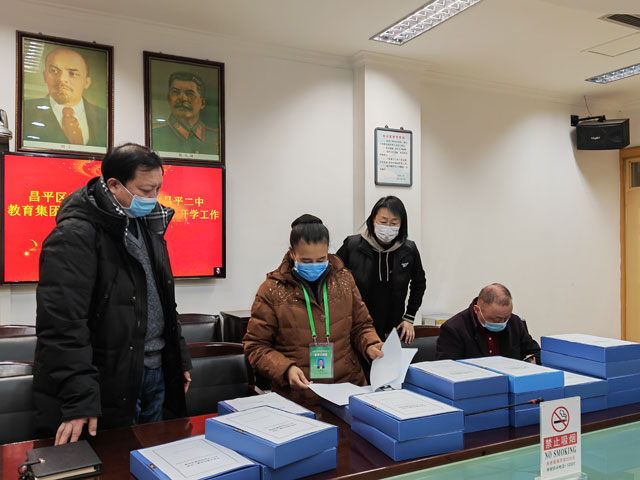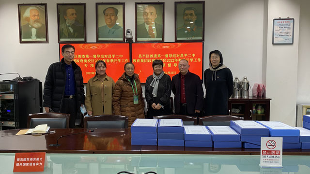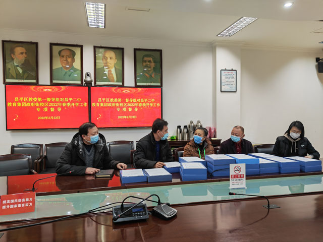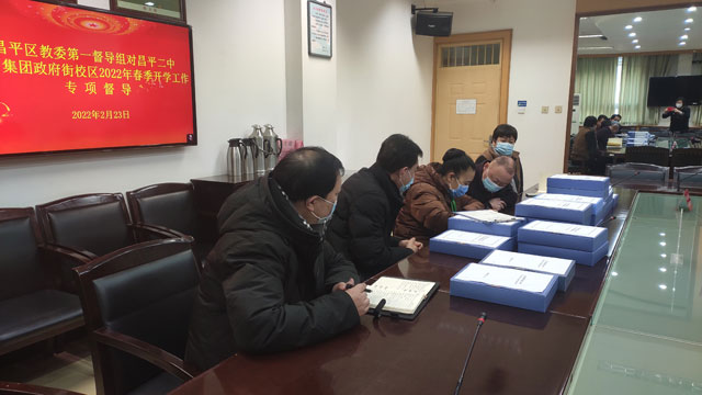 2022年2月23日下午,昌平区督导室第一责任区督导组挂牌督学虎素菊到昌平二中教育集团政府街校区进行2022年春季开学工作专项督导检查。按照市、区教委统一部署,挂牌督学通过听汇报、查看材料、实地考察、访谈等方式,对人员返校和疫情防控、校园安全、假期活动等工作进行全面了解,督促指导学校切实做好春季开学各项准备工作,确保安全有序顺利开学。昌平二中教育集团党委书记褚春梅、副书记王世国,政府街校区党总支书记、德育副校长李继阳,教学副校长张云、工会主席闫静,办公室主任、安全管理干部王洁睿陪同检查。