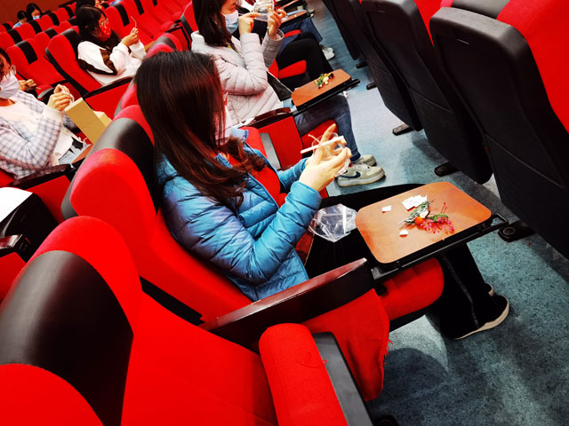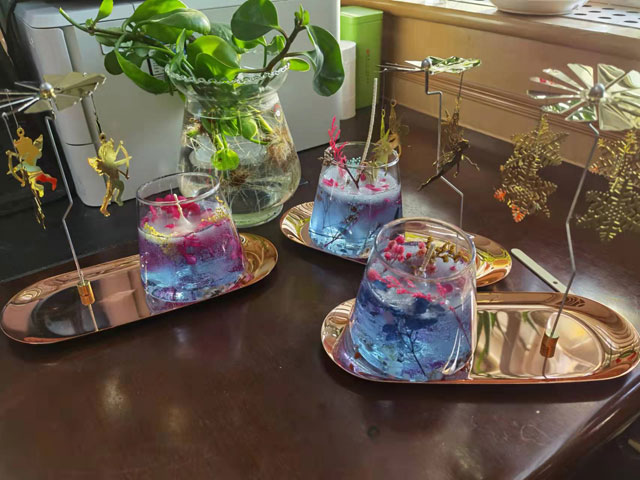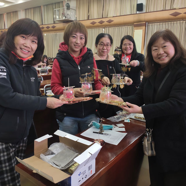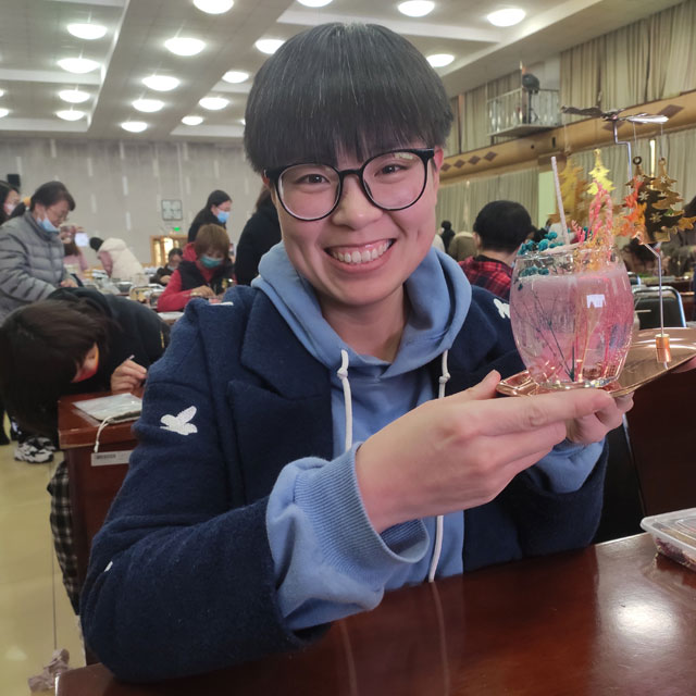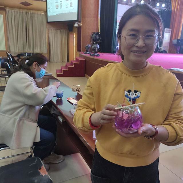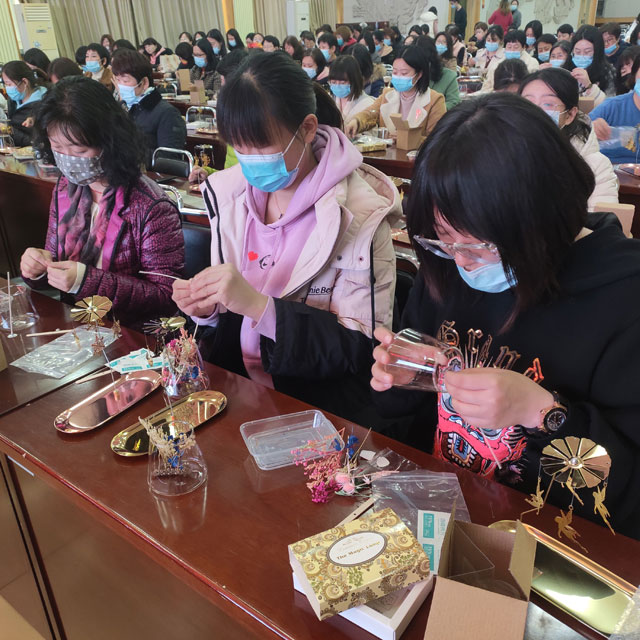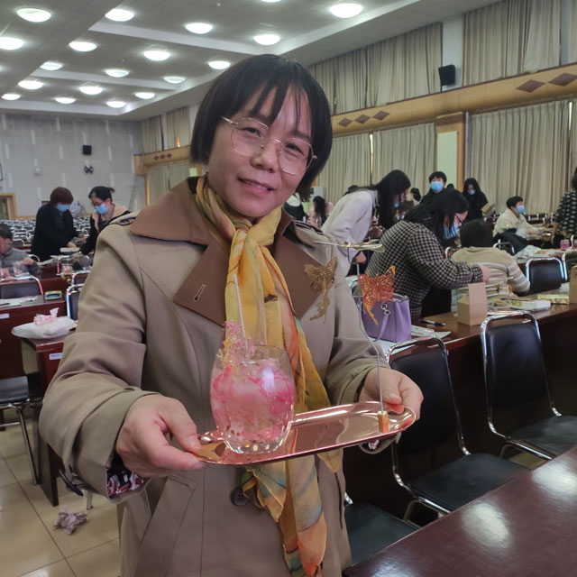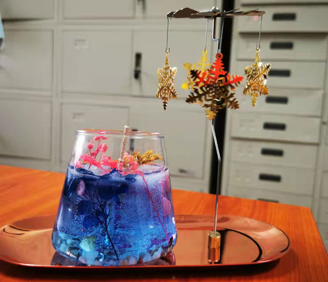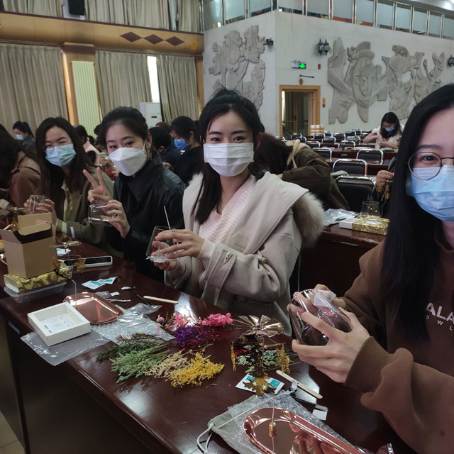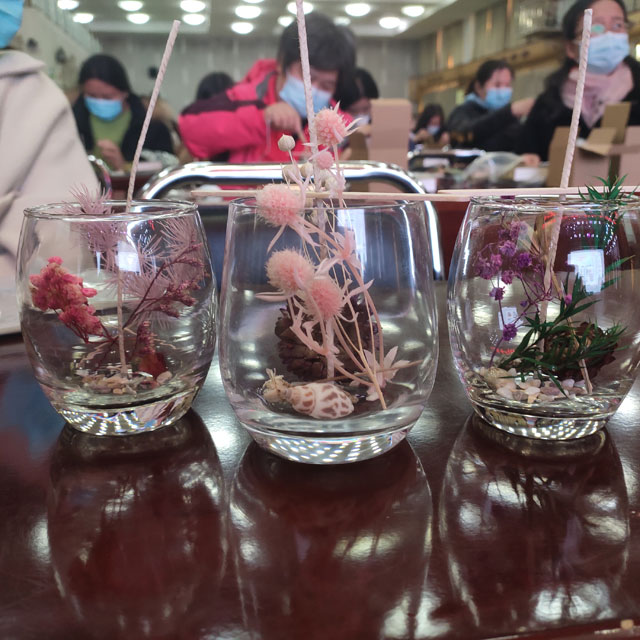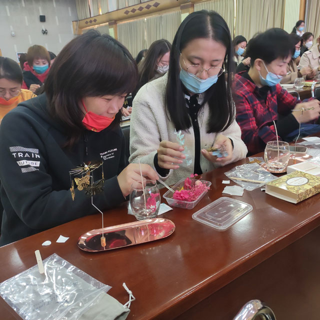 活动现场,芳香四溢。在老师的讲解和指导下大家积极投入到自己作品的创作中,根据杯型巧妙构思,依据喜好调配颜色,利用花卉或饰品设计造型,倒入热好的融合了葡萄柚香熏精油的豆蜡,待冷却后放入走马灯托盘,充满浪漫气息且具有个性化的的走马灯香熏蜡烛杯便大功告成,老师们相互切磋,对自己的劳动所得爱不释手。