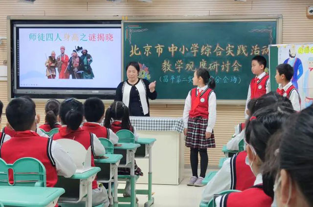 昌平二中教育集团昌平第二实验小学校区陈晓晓、吴红颖两位教师带着学生开展了以《西游记》中计量单位的研究”为主题的跨学科综合实践活动并进行成果汇报。课堂上精彩地呈现了孩子们的研究过程与成果,比如以PPT的形式讲解《西游记》中的“时间”问题,现场讲解和模拟计时工具日晷及沙漏的制作过程,观看学生制作水钟的视频以及课本剧展现师徒四人身高之谜的破解过程等,充分展现了学生在这个过程中的成长与收获。