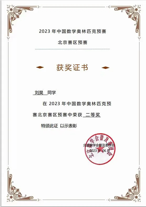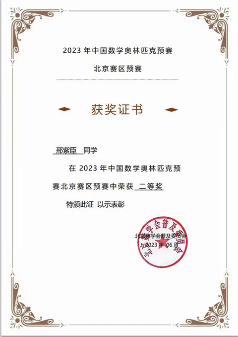 2023年9月第40届全国中学生物理竞赛复赛(北京赛区)中高二年级邱家承同学取得二等奖(郊区县仅3人,全区共1人),位居十个郊区第一。