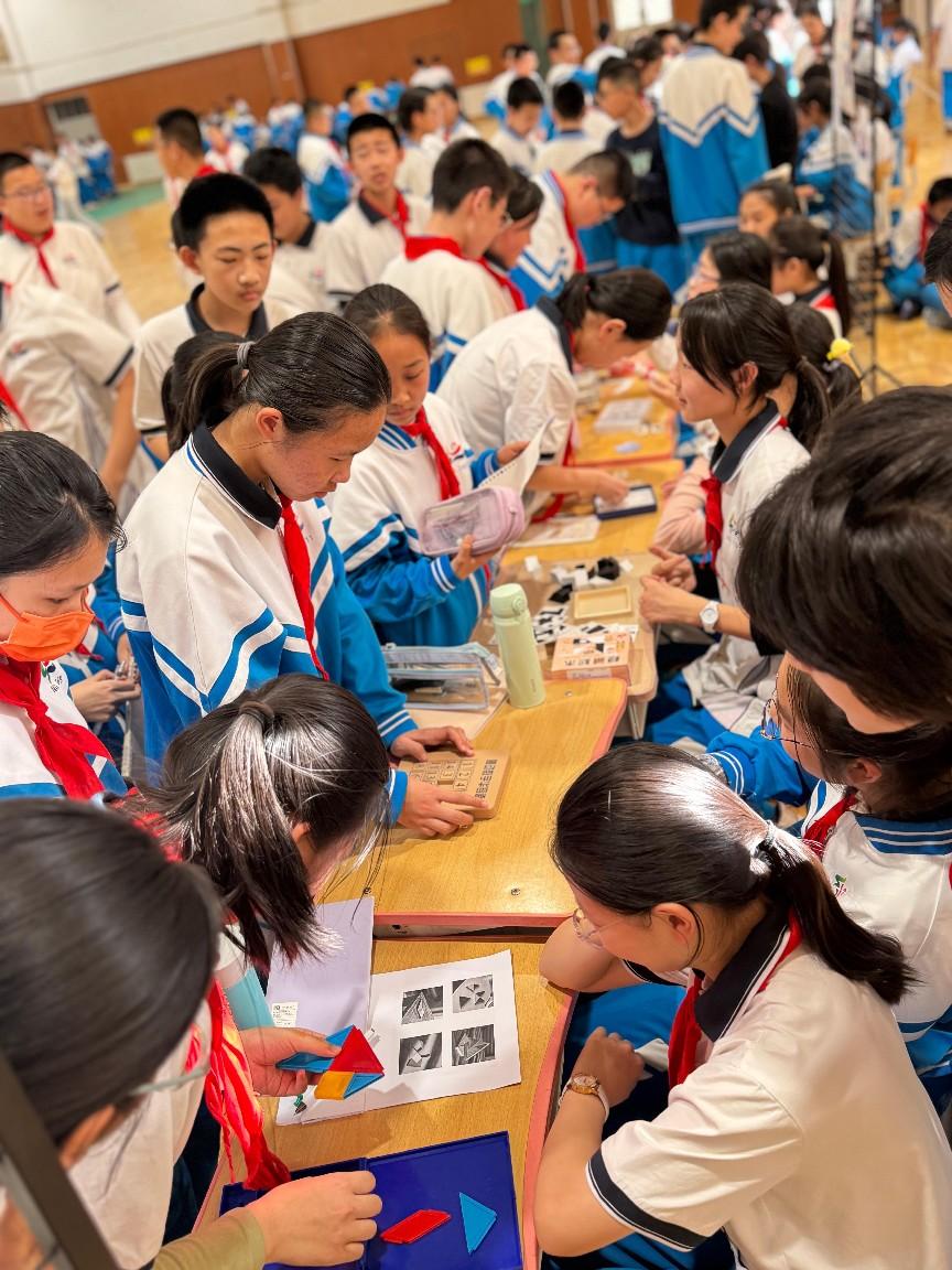 在数学嘉年华的最后,最受同学们期待的数学嘉年华“π”对终于到来!体育馆变成了一个充满挑战与乐趣的数学游戏乐园,各班设置了七巧板、五子棋等不同的数学游戏关卡,体育馆内欢声笑语,同学们手持闯关卡,自由穿梭于各个展台,热情高涨。