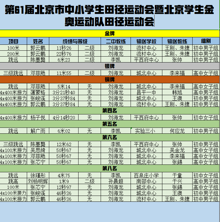此外,在北京学生金奥运动队田径比赛中,昌平二中金奥运动队表现亮眼,荣获3枚金牌、3枚银牌、1枚铜牌。获奖队员分别为郭云鹏、陈墨龑、邓菲飏、高子健,教练员为刘海龙、李凯、马俊军。