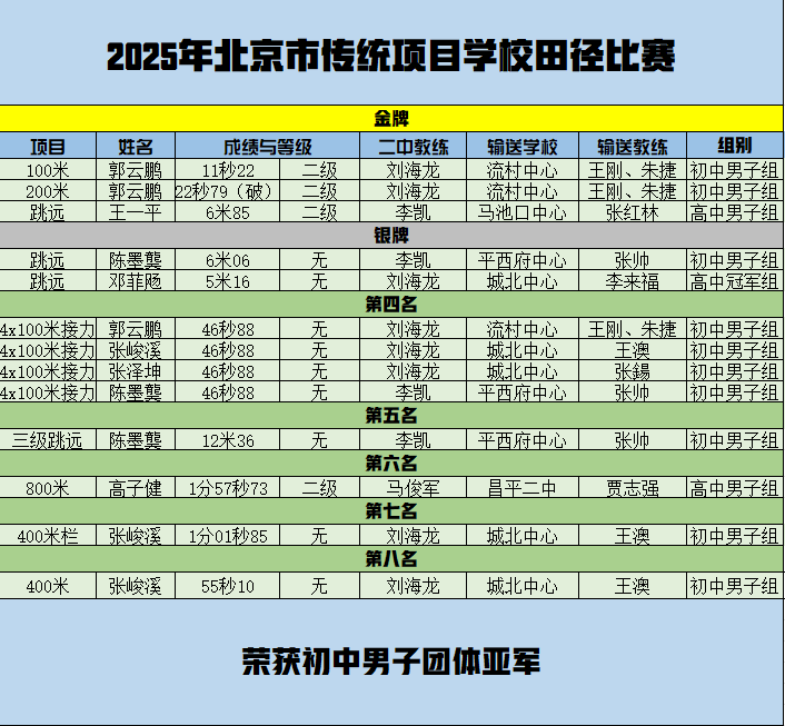 在由北京市体育局、北京市教育委员会主办的2025北京市中小学生体育传统项目学校田径赛上,来自北京市168所中小学,共计1759名运动员参加此次赛事。昌平二中金奥田径队11名小将团结协作、突破自我,不仅收获3金2银,初三7班郭云鹏同学,更是打破尘封17年的初中男子200米纪录(指导教师刘海龙),助力团队夺得初中男子团体总分亚军,每一份荣誉都超给力!