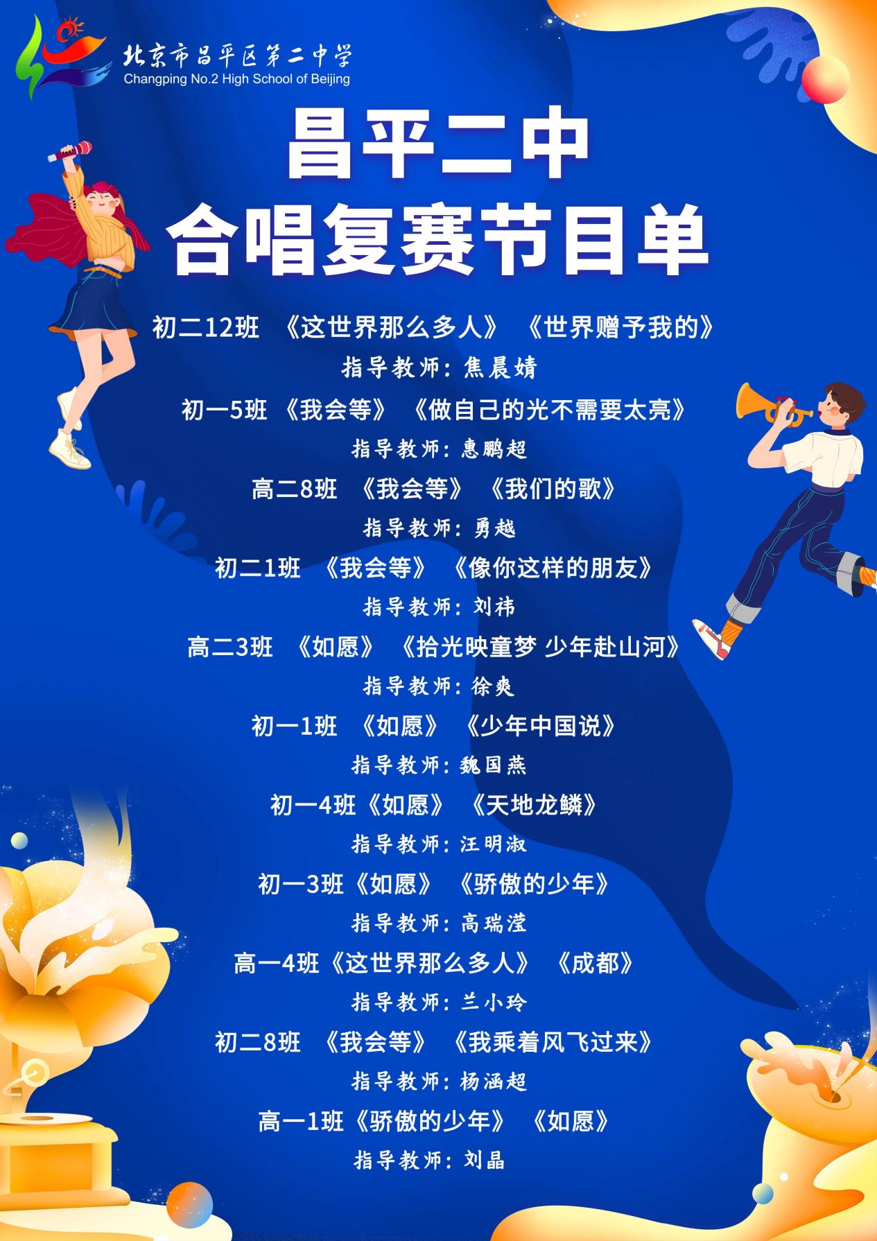 合唱比赛复赛出席领导以及学生评委代表有:昌平二中德育校长高宇,德育主任翟春平,德育副主任艺体美负责人暴娥净,团委书记高佳星,初一年级主任高伟,初二年级主任刘玉红,高一年级主任刘英军,高二年级主任王玲。