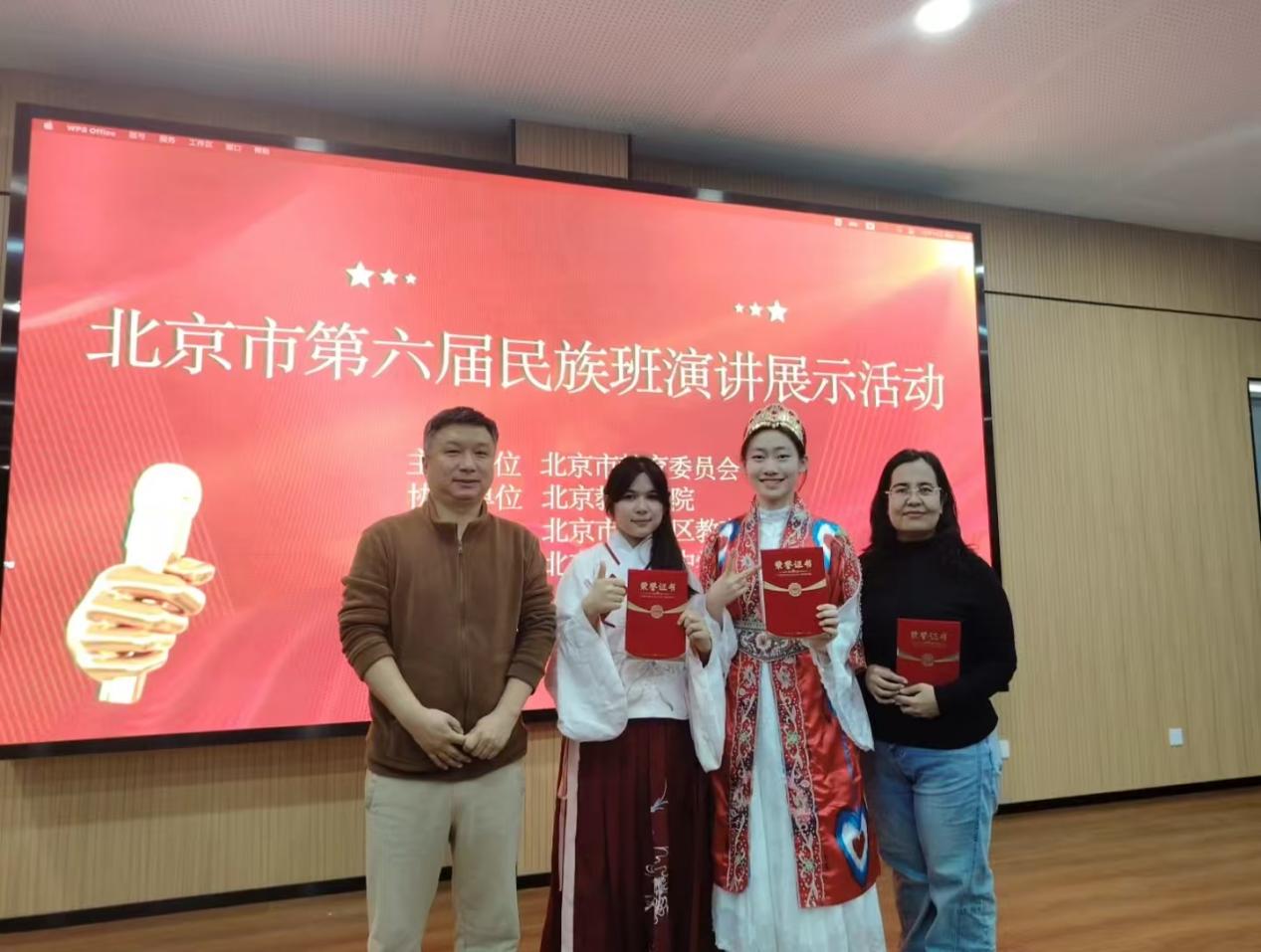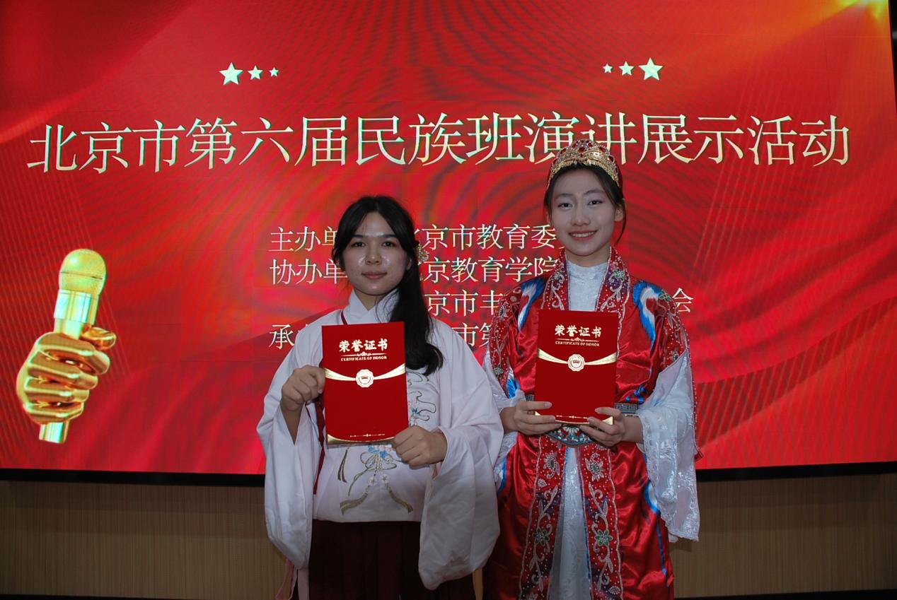 本次活动由北京市教育委员会主办,北京教育学院、北京市丰台区教育委员会协办,北京市第十中学承办。本次演讲活动以“铸牢共同体,同圆复兴梦”为主题,采取“结对共创”形式,演讲展示自创作品。共有北京市各区县17所民族班学校学生参加比赛。在所有展示中,我校两位同学的演讲脱颖而出,展示了两名同学之间互帮互助、文化交流、共同成长的感人故事,生动体现交往、交流、交融的深刻内涵。充分展现了我校学子的精神风貌与各民族交融共进的美好图景。