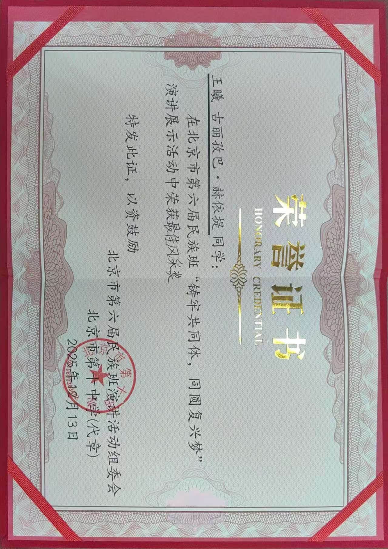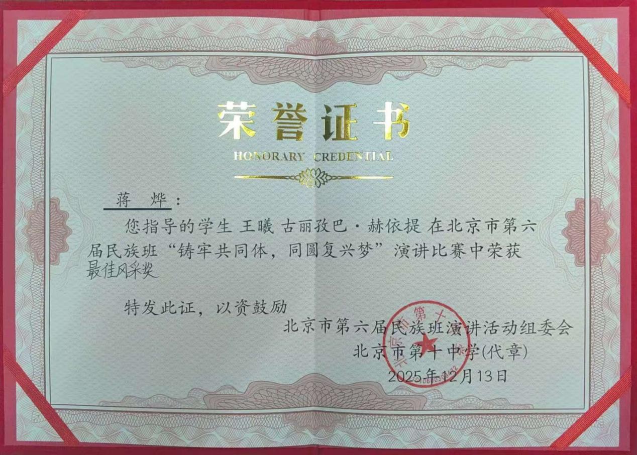 我校高一5班王曦、高二6班古丽孜巴·赫依提共同创作、演讲的《石榴花与杨柳枝 同绘一副春》在2025年12月14日举办的北京市第六届民族班演讲活动中,荣获“最佳风采奖”。蒋烨老师被评为优秀辅导教师。